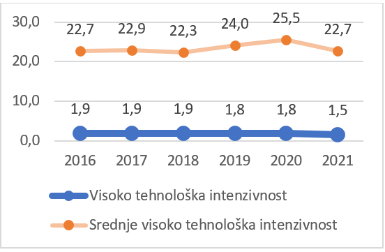 U 2021. godini udio izvoza visoko-tehnoloških proizvoda u ukupnom izvozu FBiH najniži je u posljednjih 6 godina (1,5%), dok se udio izvoza srednje-tehnoloških proizvoda, nakon rasta, vratio na nivo iz 2016. godine i iznosi 22,7%.