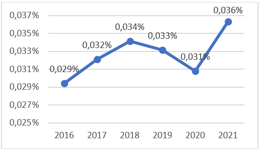 Udio izvoza BiH u ukupnom svjetskom izvozu, nakon usporavanja u toku pandemije COVID-19, ponovo je počeo da raste, te je u 2021. godini najviši u posljednjih 6 godina (0,036%).