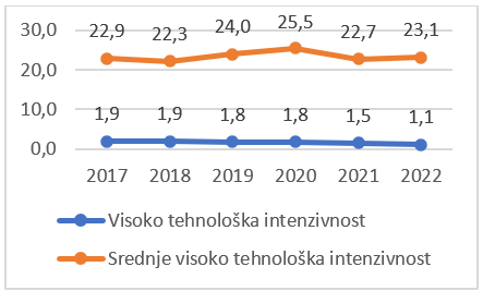 U 2022. godini, udio izvoza visoko-tehnoloških proizvoda u ukupnom izvozu FBiH najniži je u posljednjih 6 godina (1,1%), dok se udio izvoza srednje-tehnoloških proizvoda povećao sa 22,7% (2021) na 23,1%.