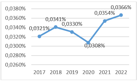 Udio izvoza BiH u ukupnom svjetskom izvozu, nakon usporavanja u toku pandemije COVID-19, ponovo je počeo da raste, te je u 2022. godini najviši u posljednjih 6 godina (0,0366%).