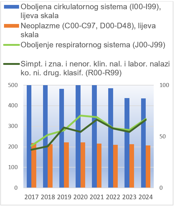 Specifični mortalitet od bolesti, na 100.000 stanovnika u FBiH (2017-2024)