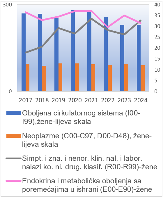 Specifični mortalitet od bolesti, žene na 100.000 stanovnika (2017-2024)