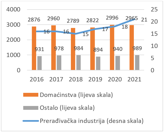 U 2021. godini potrošnja toplotne energije u domaćinstvima iznosila je 2.965 TJ, što je za 1% manje u odnosu na prethodnu godinu.
