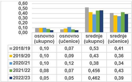 % učenika koji su prekinuli osnovno i srednje školovanje u FBiH, (ukupno i učenice)