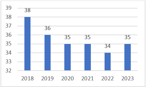 Indeks percepcije korupcije je na istom nivou proteklih nekoliko godina (35). Bosna i Hercegovina, od 180 zemalja, rangirana je na 108. mjestu.