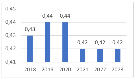 Prema faktoru 2 Indeksa vladavine prava – Odsustvo korupcije, vrijednost indeksa je ista u odnosu na prethodne godine. Globalni prosjek za 2023. godinu iznosi 0.51. Indeks za BiH je ispod globalnog prosjeka.