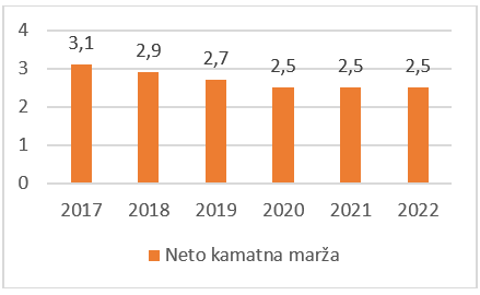 Neto kamatna marža, odnosno razlika između kamatnih stopa na kredite i kamatnih stopa na depozite, je na istom nivou posljednje tri godine i iznosi 2,5%. U periodu 2017-2020. godina zabilježen je trend smanjenja kamatne marže, što je ukazivalo na smanjenje troškova finansijskog posredovanja.