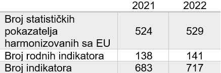 U 2022. godini zabilježen je veći broj statističkih pokazatelja harmonizovanih sa EU, rodnih indikatora i ukupnih indikatora.