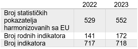 U 2023. godini zabilježen je porast broja statističkih pokazatelja harmonizovanih sa EU, broja rodnih indikatora, kao i broja indikatora.