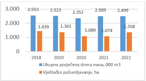 Vještački pošumljene površine zemljišta tokom perioda od 2018. do 2022. godine bilježi promjenjivo kretanje. U 2022. godini, pošumljeno je ukupno 1.358 ha površine, što je za 26,4% više u odnosu na 2021. godinu.