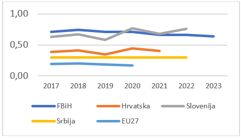 Udio dodane vrijednosti oblasti šumarstva, u BDP-u, u Federaciji BiH, u periodu od 2017. do 2023. godine, bilježi relativno stabilne vrijednosti. U 2023. godini, zabilježen je udio od 0,64%, na nivou od prethodne godine. U poređenju sa prosjekom EU i zemalja okuženja, FBiH bilježi nešto veće učešće. Od pomenutih zemalja, jedino je u Sloveniji zabilježen veći udio (0,76%).