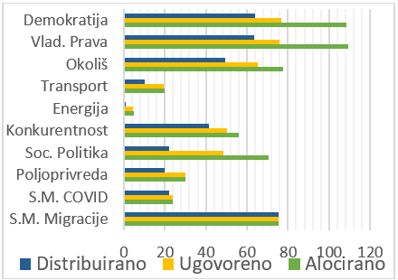 IPA II BiH - implementacija po sektorima (mil EUR)