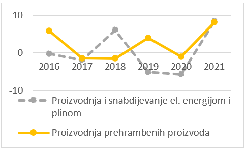 Proizvodnja prehrambenih proizvoda bilježi rast za 8,1% u 2021. godini, a Proizvodnja i snabdijevanje električnom energijom i plinom rast za 8,4%. Kretanja u periodu 2016-2021. godine prikazuju pad proizvodnje u oba područja 2020. godine, kao posljedica pandemije koronavirusom.