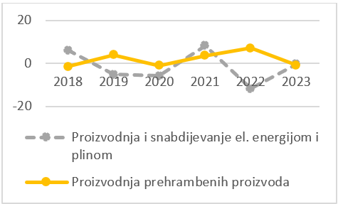 Proizvodnja prehrambenih proizvoda bilježi blagi pad za 0,7% u 2023. godini, a Proizvodnja i snabdijevanje električnom energijom i plinom pad za 0,37%, u odnosu na prethodnu godinu. Tokom protekle godine hidrološka situacija je bila značajno lošija u odnosu na 2021., te je proizvodnja u hidroelektranama smanjena za oko 30%, a proizvodnja u termoelektranama za 2% (podaci DERK-a). Snabdijevanje plinom je zavisilo od političkih odluka u Rusiji.