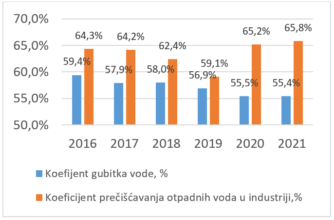Koeficijent gubitka vode, mjeren odnosom ukupnih gubitaka vode i ukupne zahvaćene količine vode, u periodu od 2016. do 2021. godine pokazuje pozitivan trend, odnosno opadanje koeficijenta gubitka vode, sa najnižim iznosom u 2021. godini (55,4%).