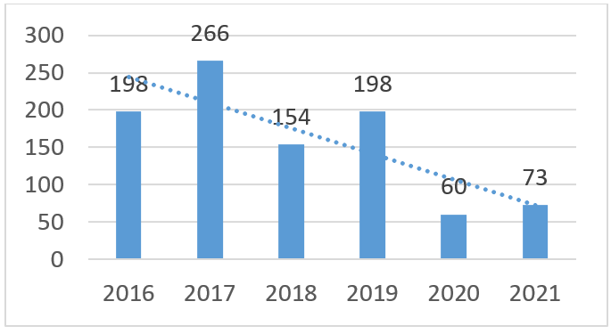 U 2020. i 2021. godini vrijednost ovog indikatora je ispod utvrđenog cilja do 2027. godine (100), te je u narednim godinama potrebno zadržati prosjek ispod navedene vrijednosti.