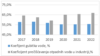 Koeficijent prečišćavanja otpadnih voda u industriji bilježi promjenjivo kretanje u posmatranom periodu. U 2022. godini, ukupno je pročišćeno 67,0% ukupne količine otpadnih voda iz industrije, što je 1,2 p.p. više u odnosu na 2021. godinu i na najvišem je nivou u posmatranom periodu od 2017. do 2022. godine.