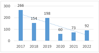 U periodu 2020-2022. godina, vrijednost ovog indikatora je ispod utvrđenog cilja do 2027. godine (100), te je u narednim godinama potrebno činiti napore na zaustavljanju daljeg trenda rasta.