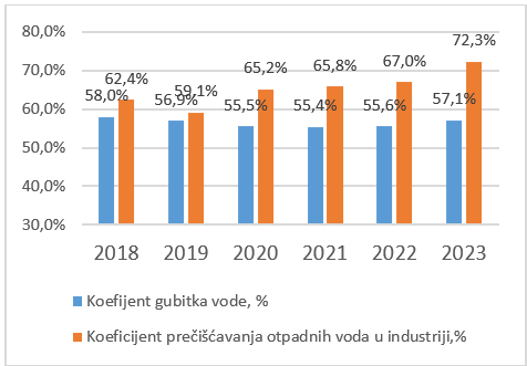 Koeficijent gubitka vode, mjeren odnosom ukupnih gubitaka vode i ukupne zahvaćene količine vode, u posljednje dvije godine pokazuje negativan trend rasta. U 2023. godini, ovaj koeficijent iznosio je vrijednost 57,1%, za 1,5 pp više u odnosu na 2022. godinu.