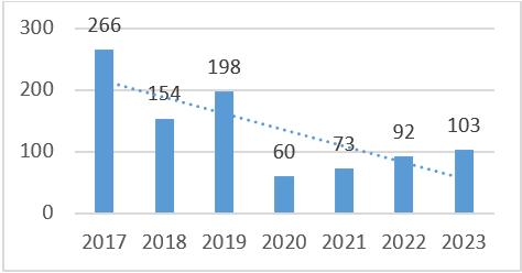 U odnosu na periodu 2020-2022. godina, kada je vrijednost ovog indikatora bila ispod utvrđenog cilja do 2027. godine (100), u 2023. godini je zabilježena vrijednost iznad utvrđenog cilja, odnosno 103 slučaja na 100.000 stanovnika, što je u odnosu na 2022. godinu više za 12%. Potrebno je uložiti dodatne napore kako bi se zaustavio negativan trend rasta broja oboljelih ovim uzrokom.
