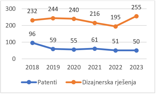 U 2023. godini, u BiH broj prijava za patentska rješenja ostao je na istom nivou kao i godinu ranije, dok je broj prijava za dizajnerska rješenja povećan za 30,8%.