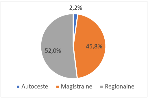 Od ukupno 4.984 km cesta na na autoceste se odnosi 2,2%, na magistralne ceste se odnosi 45,8%, dok se na regionalne ceste odnosi 52,0%.