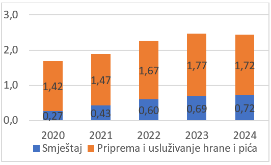 Procenat bruto dodane vrijednosti područja djelatnosti I-Djelatnosti pružanja smještaja, te pripreme i usluživanja hrane (hotelijerstvo i ugostiteljstvo) u BDP-u je u 2024. godini opao za 0,03 p.p., u odnosu na 2023. godinu.