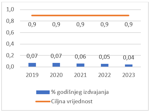 Za praćenje realizacije ove mjere koristimo procenat bruto domaćih izdataka za istraživanje i razvoj u poslovnom sektoru u BDP-u. Ovaj indikator je u 2023. godini imao vrijednost 0,04%, i manji je u odnosu na 2022. godinu. Ukupna vrijednost ovih izdataka u FBiH, u 2023. godini iznosila je 14,1 mil. KM, i bila je manja za 5,7% u odnosu na 2022. godinu kada je bila 15,0 mil. KM.