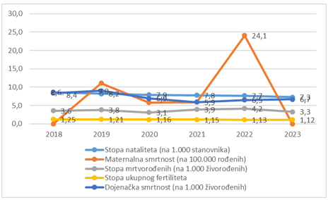 Demografska slika stanovništva u FBiH je sve nepovoljnija. U periodu 2018-2023. godina bilježi se konstantan pad broja živorođene djece. U istom periodu stopa mrtvorođenih na hiljadu živorođene djece je promjenljiva, s tim da je u 2023. godini manja u odnosu na prethodnu godinu za 0,9 p.p. Stopa ukupnog fertiliteta konstantno opada. Da bi se obezbijedila stopa proste reprodukcije stanovništva, stopa ukupnog fertiliteta treba biti na nivou 2,1 dijete po ženi. Stopa maternalne smrtnosti u FBiH je veoma niska, kao i u većini evropskih zemalja. Prema podacima FZS, u 2023. nije bilo smrtnih slučajeva žena u periodu trudnoće, porođaja i purperijuma.