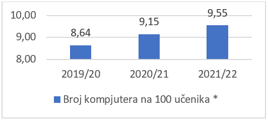 Zabilježen je blagi napredak u opremljenosti računarima na 100 učenika u osnovnim i srednjim školama. Obrazovne politike trebaju podizati standarde obrazovnim institucijama i potrebno je osigurati dostupnu opremu svakom učeniku i studentu zbog informacijske pismenosti i razvoja digitalnih vještina. Također je potrebno osigurati saradnju obrazovnog sistema i kompanija u IKT sektoru. |
