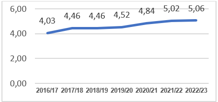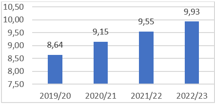 U periodu 2019/20 - 2022/23 godina, bilježi se trend porasta ukupnog broja računara za učenike u srednjim školama. U 2022/23 školskoj godini pristup internetu je bio 88,9%.