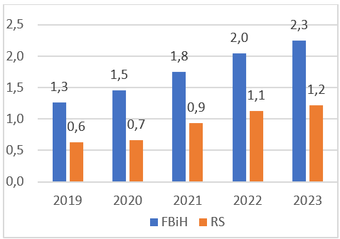 Posmatrajući učešće broja zaposlenih u IT sektoru, u odnosu na ukupno zaposlene, uočen je nastavak trenda povećanja i u 2023. godini, u FBiH je 2,3% zaposlenih u IT, dok je u RS-u 1,2%.