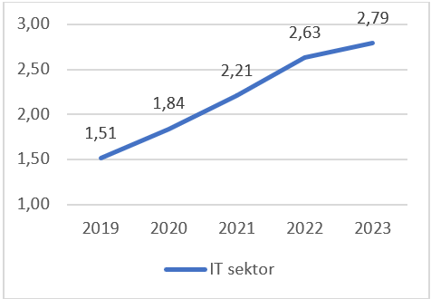 U 2023. godini indikator % učešća bruto dodane vrijednosti IT sektora u BDP-u, je zabilježio napredak u odnosu na prošlu godinu. Učešće dodane vrijednosti je poraslo sa 2,63% na 2,79% BDP-a.