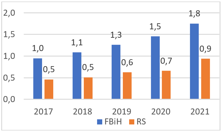 Posmatrajući učešće broja zaposlenih u IT sektoru u odnosu na ukupno zaposlene, uočen je nastavak trenda povećanja. U 2021. godini u FBiH je 1,8% zaposlenih u IT, dok je u RS-u 0,9%.
