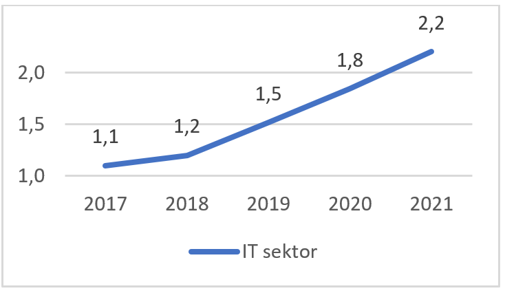 Prema Registru poslovnih subjekata (Administrativni registar) koji vodi Federalni zavod za statistiku, u IT sektoru, odnosno u oblastima 62-Računarsko programiranje, savjetovanje i djelatnosti u vezi s njima i 63-Informacijske uslužne djelatnosti u 2021. godini bilo je 1.784 preduzeća. Odnosno, procenat godišnje promjene broja preduzeća u IT sektoru u 2021. godini u odnosu na 2020. godinu bio je 8,1%.