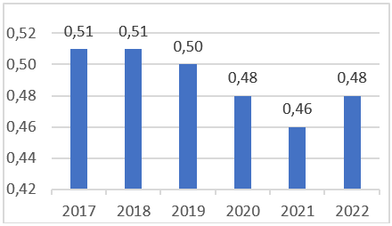 Ključni indikator mjere pokazuje smanjenje broja neriješenih privrednih predmeta i ima pozitivan trend. Indikator Neovisnost pravosuđa bilježi rast vrijednosti u 2022. godini. Potrebno je staviti veći fokus na nezavisnost rada sudija i tužilaca, te izraditi analizu rada privrednih odjeljenja sudova sa ciljem sagledavanja opravdanosti uvođenja i osnivanja privrednih sudova. |