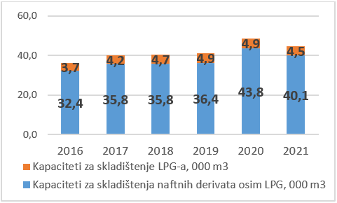 Ukupni kapaciteti za skladištenje naftnih derivata i LPG-a u FBiH (uključujući i one u privatnom vlasništvu), za koje su izdate dozvole FERK-a, u 2021. godini iznose 44,6 hilj. m3, što je u odnosu na 2020. godinu manje za 4,1 hilj. m3 ili za 8,4%.