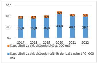 Kapaciteti za skladištenje naftnih derivata i LPG-a, 000 m3