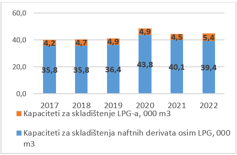 Ukupni kapaciteti za skladištenje naftnih derivata i LPG-a u FBiH (uključujući i one u privatnom vlasništvu), za koje su izdate dozvole FERK-a, u 2022. godini iznose 44,8 hilj. m3, što je u odnosu na 2021. godinu više za 0,2 hilj. m3 ili za 0,4%. Od ukupnog skladišnog kapaciteta, na skladišta naftnih derivata (osim LPG-a) se odnosi 39,4 hilj. m3, odnosno 87,9%.
