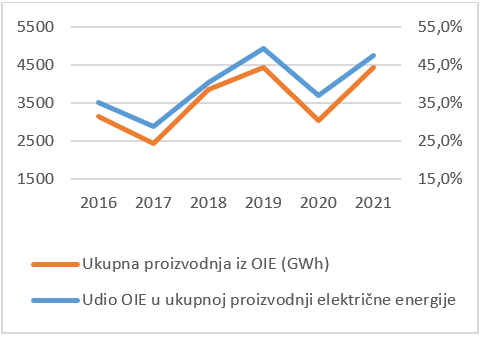 Ukupna proizvodnja električne energije iz OIE tokom perioda od 2016 – 2021. godine bilježi promjenjivo kretanje, uglavnom uslovljena promjenjivim hidrološkim prilikama i posljedično promjenjivom proizvodnjom u velikim HE. U 2021. godini, ukupna proizvodnja el. energije iz OIE iznosila je 4.429 GWh, sa udjelom od 47,7% u ukupnoj proizvodnji.