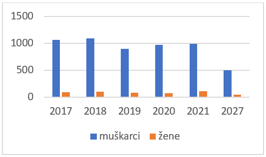 Broj poznatih prijavljenih lica za krivična djela iz oblasti brak, porodica mladež u 2021. je umanjen samo za 4% u odnosu na polaznu vrijednost (2017), žene su i dalje uglavnom žrtve nasilja.