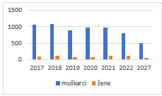Broj poznatih prijavljenih lica muškaraca za krivična djela iz oblasti brak, porodica mladež u 2022. godini je umanjen za 23% u odnosu na polaznu vrijednost (2017), ali je broj počinioca žena porastao za 10,5%.