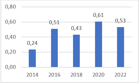 Obzirom da se podaci o indeksu E-učešće objavljuju svake dvije godine, za 2023. godinu isti nisu dostupni. Uzimajući u obzir prethodne trendove očekuje se pad vrijednosti indeksa.