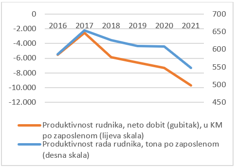 Produktivnost rudnika je na veoma niskom nivou. Od 2017. godine bilježi se negativan trend rasta neto gubitka po zaposlenom, koji je u 2021. godini dostigao iznos 9.693 KM po zaposlenom, pogotovo naglašen zbog činjenice da se kontinuirano smanjuje broj zaposlenih.