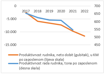 Produktivnost, izražena u tonama po zaposlenom, takođe opada. Prema zadnje dostupnom podatku, u 2021. godini je iznosila 547 tona po zaposlenom, što je u poređenju sa 2020. godinom niže za 10,2%, a u odnosu na 2017. godinu, kada je bila na najvišem nivou, niža je za 16,4%.