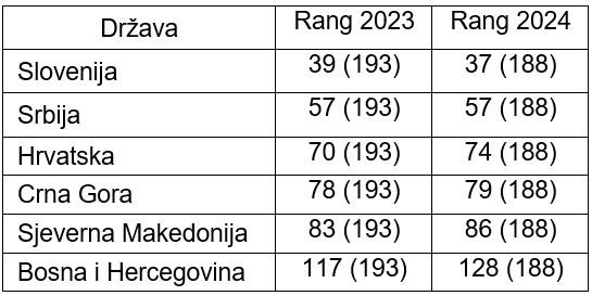 Od ukupno 188 zemalja, u 2024. godini, BiH se nalazi na 128. mjestu. To je najlošija pozicija od svih zemalja Istočne Europe. Od ostalih zemalja komparatora Slovenija je na 37, Srbija je na 57, Hrvatska na 74, Crna Gora 79. i Sjeverna Makedonija na 86. mjestu. Prema autorima ovog indeksa, za ovakve pozicije zemalja koje ne pripadaju EU zaslužan je nedostatak adekvatnog inovacionog ekosistema za njegovanje VI vještina i tehnologija, kao i stagnacija ekonomskog rasta i odliv mozgova. Ako BiH ne počne sustizati susjedne države, suočiće se s ranjivošću u raznim sektorima, što će uticati na rast, konkurentnost, održivost, uključenost, sigurnost i stratešku snagu.