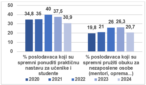 U izvještajnoj godini, 69,1% poslodavaca, od ukupno anketiranih, nemaju mogućnosti (mentor, oprema, prostor i materijali) prijema učenika i studenata na praktičnu nastavu, a 77,4% poslodavaca nemaju mogućnosti za organizovanje obuke nezaposlenih osoba. Prema rezultatima Ankete procjenjuje se da će poslodavci najviše zapošljavati KV radnike (64,3%), a zatim radnike sa (SSS 18,8%).