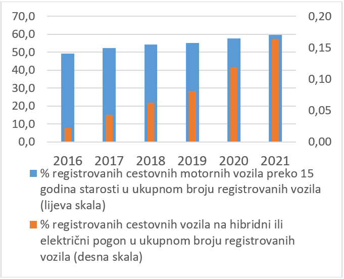 Udio registriranih cestovnih motornih vozila u FBiH starosti iznad 15 godina tokom perioda od 2016. – 2021. godine se kretao iznad 50% sa negativnim trendom rasta. U 2021. godini ovaj udio je iznosio 59,5%.