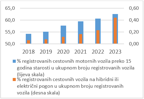 Udio cestovnih motornih vozila na hibridni i električni pogon, u ukupnom broju cestovnih motornih vozila u istom periodu, je bilježio trend rasta, dostigavši neznatan procenat od 0,44%, u 2023. godini.