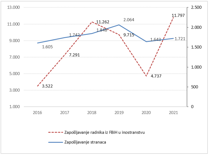 U 2021. godini izdata je 1.721 radna dozvola stranim državljanima, 78 dozvola više u odnosu na prethodnu godinu. Dozvole su uglavnom izdate stranim državljanima koji su osnivači firmi u FBiH, ili licima koji su ovlašteni za zastupanje subjekata upisa (direktori ili izvršni direktori). Od ovog broja stranih državljana kojima je izdata radna dozvola 853 su sa VSS i VŠS. Podaci o broju poslodavaca koji imaju problem sa popunjavanjem radnih mjesta nisu dostupni.